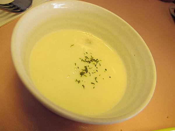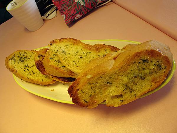 餐點有附濃湯、香蒜麵包
